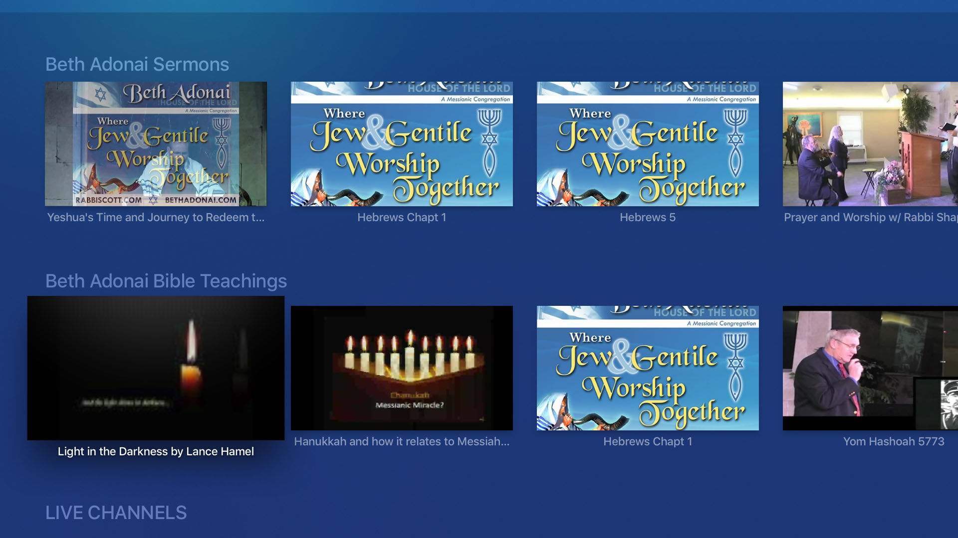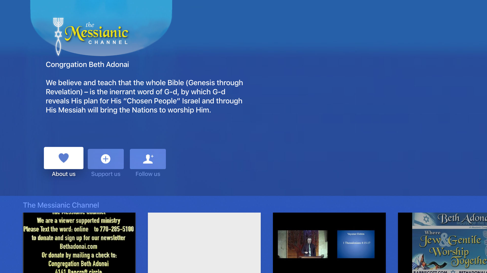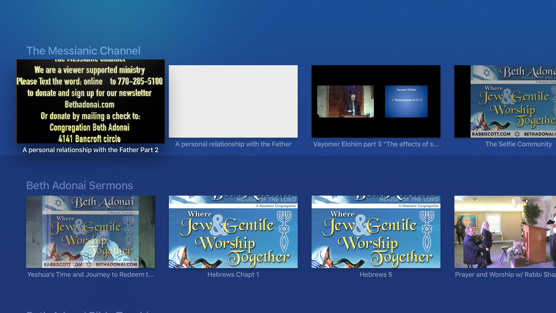 The Messianic Channel broadcast teachings on the Jewish Roots of the Christian Faith. You can view teachings from Rabbi Scott Sekulow and his wife Judy or View other teachers and weekly sermons from Congregation Beth Adonai in Tucker, GA. bethadonai.com