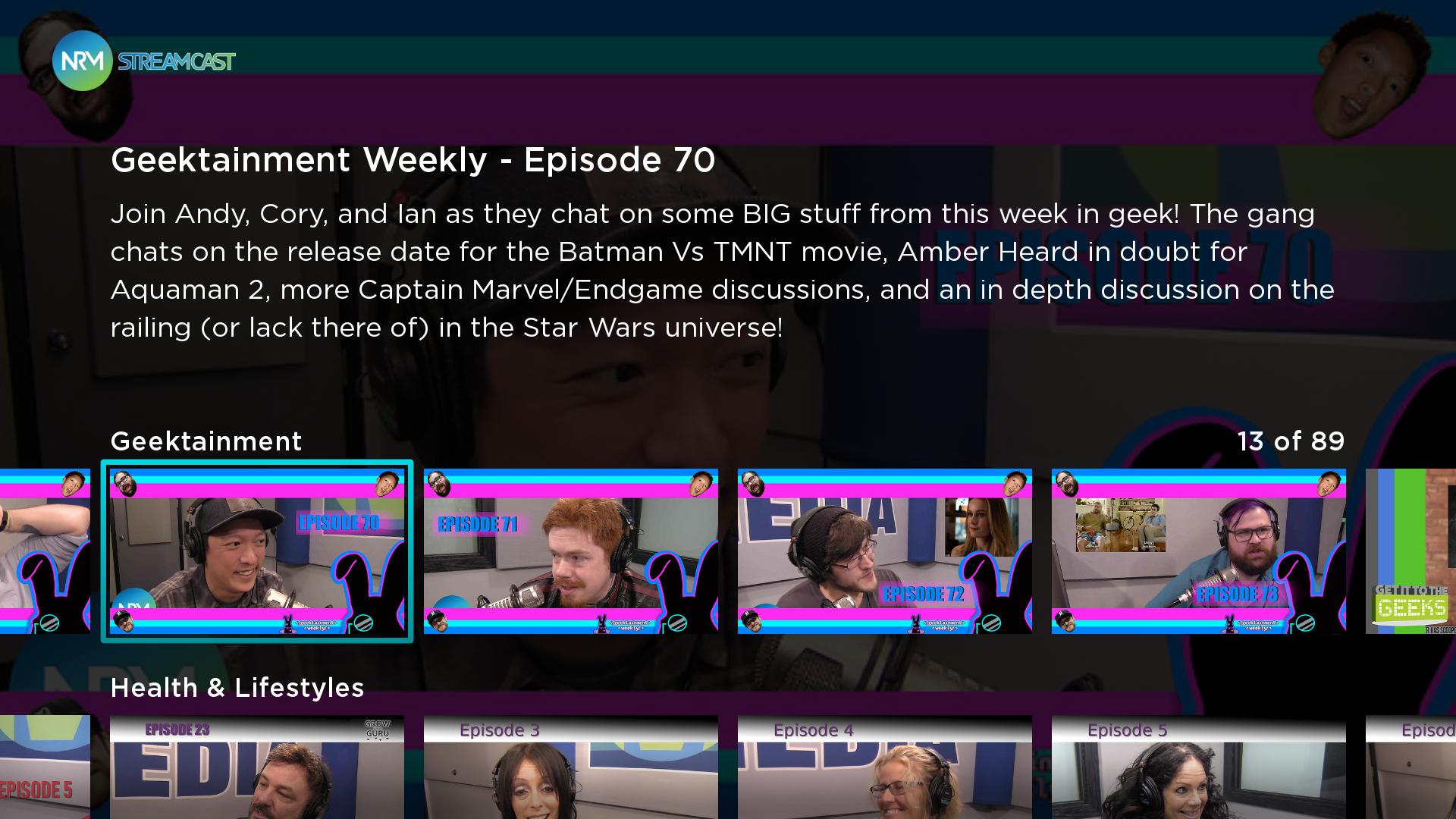 Geektainment Tv 1 - Check out our channel guide at NRMStreamcast.com for the full schedule of Live Broadcasts. NRM StreamCast is your one stop shop for exclusive content you can’t find anywhere else. Watch exciting programing that covers a wide scope of content with 5 diverse Channels: Arts & Entertainment, Business, Geektainment, Health and Lifestyles, and Sports. With all this amazing content at your fingertips, entertainment is just a click away. What are you waiting for?