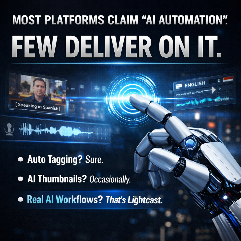 Lightcast's AI capabilities are not bolted-on features or third-party integrations. They are native to the platform and designed to work together as a unified automation system. This matters because AI tools that operate in isolation (a separate captioning service here, a manual thumbnail selector there) still leave content teams managing multiple steps and stitching workflows together manually. Lightcast's approach automates the entire chain.